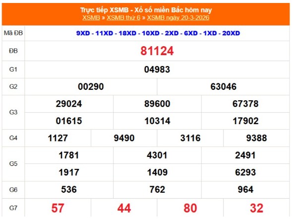 Kết quả xổ số miền Bắc ngày 20/3/2026
