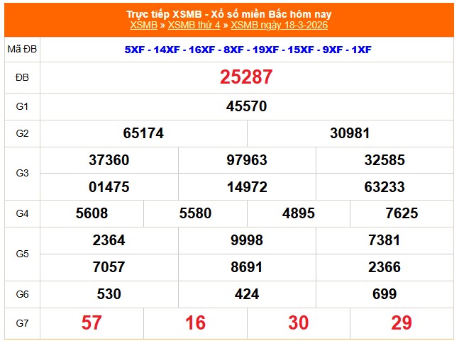 Kết quả xổ số miền Bắc ngày 18/3/2026
