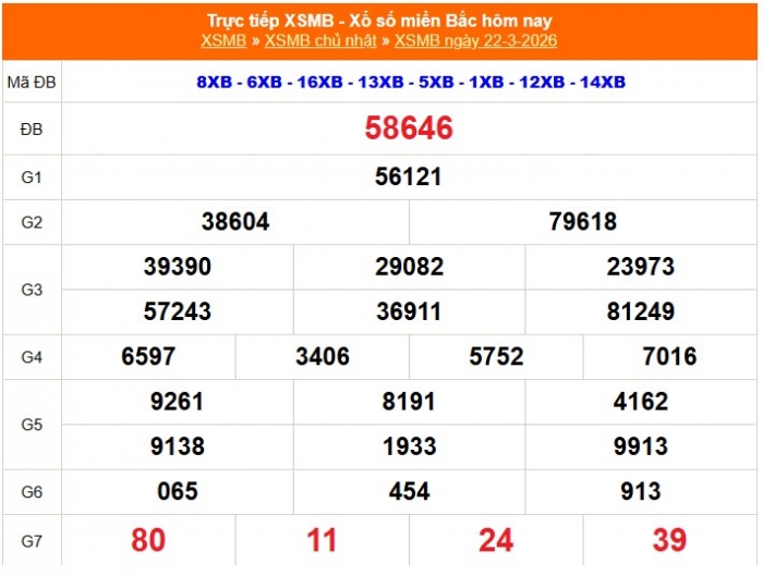 Kết quả xổ số miền Bắc ngày 22/3/2026