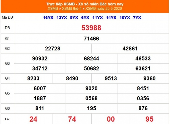 Kết quả xổ số miền Bắc ngày 25/3/2026