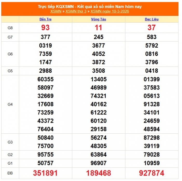 Kết quả xổ số miền Nam ngày 10/3/2026