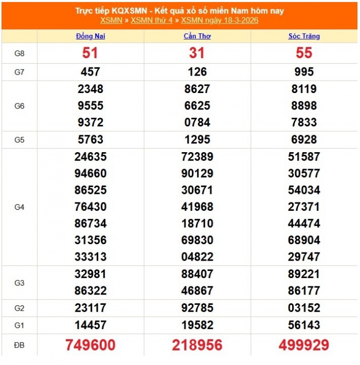 Kết quả xổ số miền Nam ngày 18/3/2026