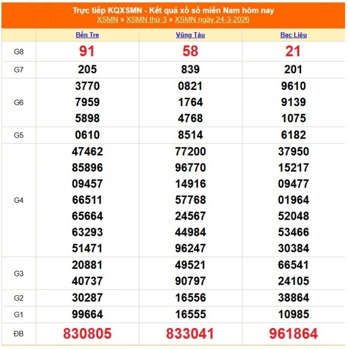 Kết quả xổ số miền Nam ngày 24/3/2026