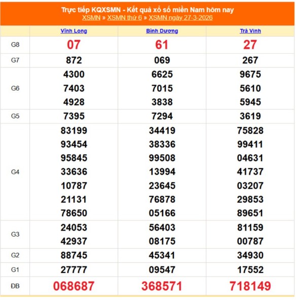 Kết quả xổ số miền Nam ngày 27/3/2026