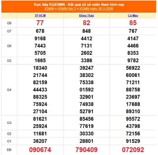 Kết quả xổ số miền Nam ngày 30/3/2026