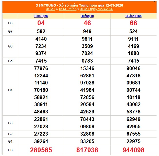 Kết quả xổ số miền Trung ngày 12/3/2026