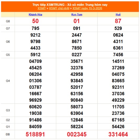 Kết quả xổ số miền Trung ngày 15/3/2026