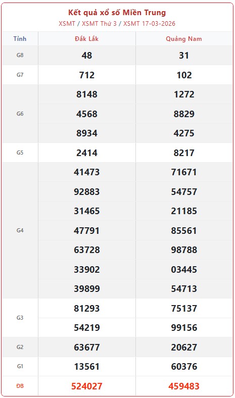 Kết quả xổ số miền Trung (XSMT) ngày 17/3/2026 được quay thưởng vào lúc 17h15 tại hai đài Đắk Lắk và Quảng Nam. Quá trình quay số mở thưởng diễn ra công khai, minh bạch theo thứ tự từ giải tám đến giải đặc biệt.