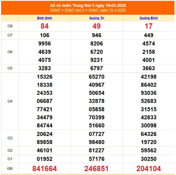 Kết quả xổ số miền Trung ngày 19/3/2026