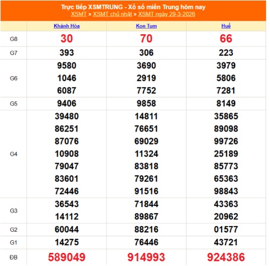 Kết quả xổ số miền Trung (XSMT) ngày 30/3/2026 được quay số mở thưởng vào lúc 17h15 theo hình thức quay lồng cầu truyền thống. Hội đồng giám sát của từng công ty xổ số kiến thiết tại các tỉnh đảm bảo quá trình quay thưởng diễn ra công khai, minh bạch.