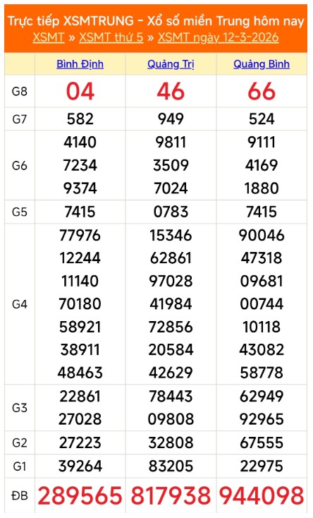 Kết quả xổ số miền Trung (XSMT) ngày 12/3/2026 được công bố vào chiều nay với 3 tỉnh Bình Định, Quảng Trị và Quảng Bình.