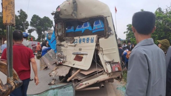 Cú va chạm mạnh khiến chiếc xe đưa đón học sinh bị đẩy trượt về phía trước khoảng 40m. Phần sau xe bị biến dạng nghiêm trọng, nhiều bộ phận hư hỏng nặng.