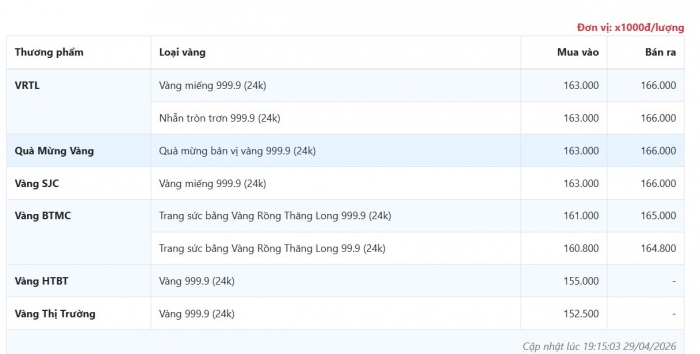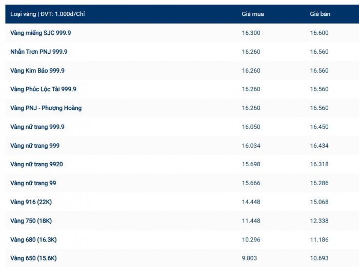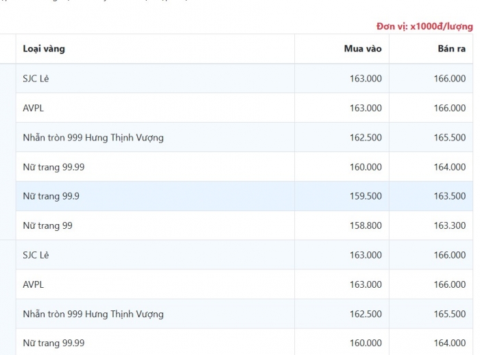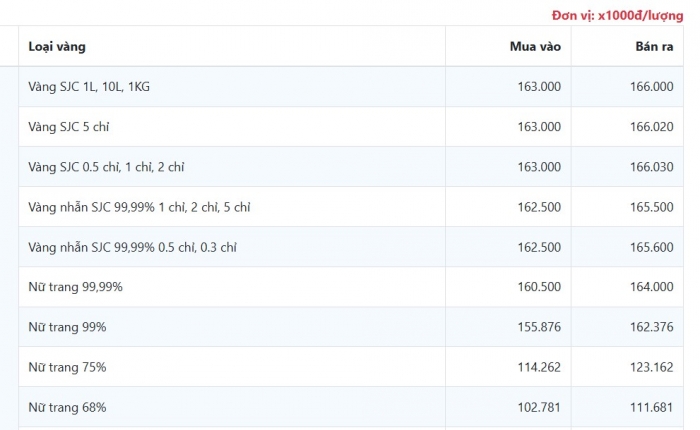 - Mua vào: khoảng 163 – 164,5 triệu đồng/lượng