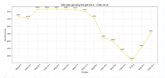 Theo cập nhật mới nhất vào chiều tối 30/4 (giờ Việt Nam), giá vàng thế giới giao ngay dao động quanh mức 4.616 – 4.639 USD/ounce, tăng mạnh hàng chục USD so với phiên liền trước. Đây được xem là cú phục hồi đáng chú ý sau khi kim loại quý từng trượt xuống vùng 4.500 USD/ounce trước đó không lâu.