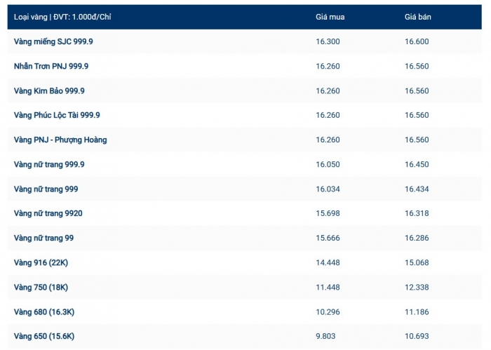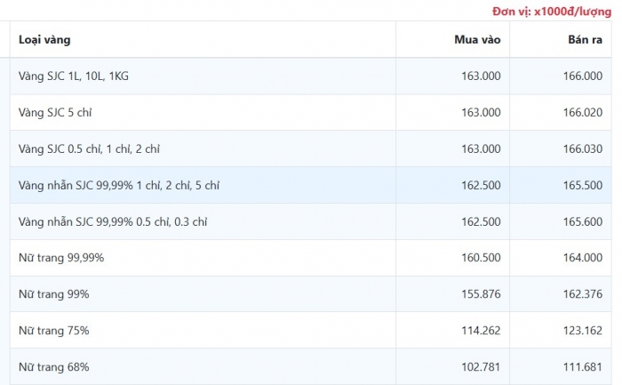 • Vàng nhẫn 9999 SJC: khoảng 162,5 – 165,5 triệu đồng/lượng