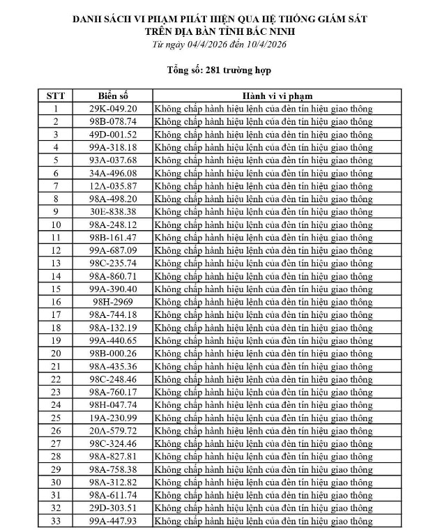Theo thông tin từ Công an tỉnh Bắc Ninh, trong khoảng thời gian từ ngày 04/4 đến 10/4/2026, qua hệ thống camera giám sát và thiết bị nghiệp vụ, lực lượng Cảnh sát giao thông đã phát hiện 281 trường hợp vi phạm trật tự an toàn giao thông. Các lỗi chủ yếu bao gồm vượt đèn đỏ, không chấp hành hiệu lệnh của vạch kẻ đường, đi sai làn, rẽ trái tại nơi có biển cấm và dừng đỗ không đúng quy định. Đáng chú ý, có 41 trường hợp ô tô vượt đèn đỏ, 19 trường hợp xe máy vượt đèn đỏ và 188 trường hợp vi phạm vạch kẻ đường, cho thấy tình trạng vi phạm vẫn diễn biến phức tạp.