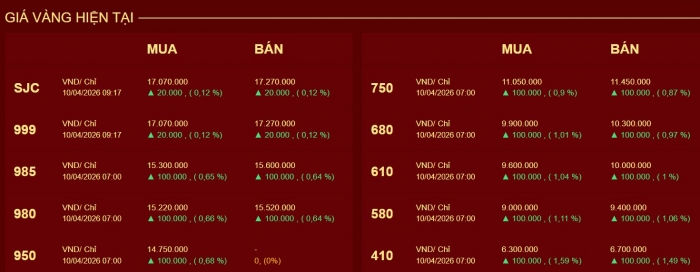Cụ thể, giá vàng miếng SJC được các doanh nghiệp lớn niêm yết quanh mức 169,7 triệu đồng/lượng ở chiều mua vào và 172,7 triệu đồng/lượng ở chiều bán ra, tăng khoảng 1,2 triệu đồng/lượng so với cuối ngày 9/4.