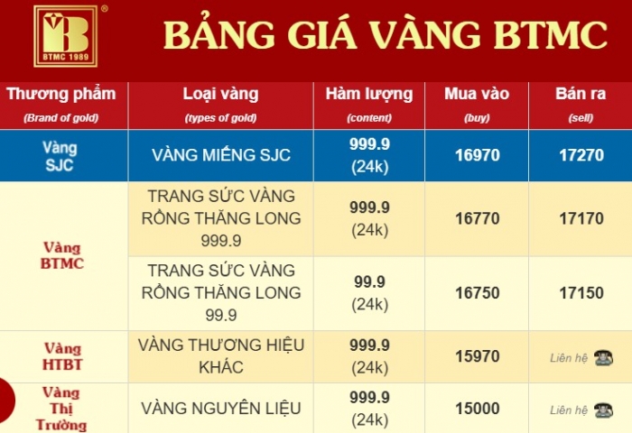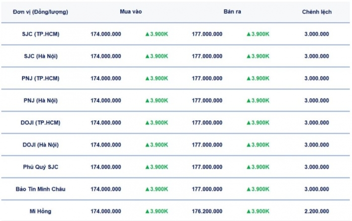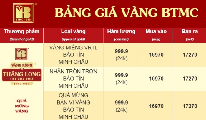 Đáng chú ý, một số doanh nghiệp niêm yết giá cao hơn mặt bằng chung. Trong đó, Mi Hồng bán ra ở mức 172,7 triệu đồng/lượng, Bảo Tín Minh Châu và Bảo Tín Mạnh Hải cũng đưa giá bán lên tới 172,7 triệu đồng/lượng – thuộc nhóm cao nhất thị trường hiện tại.