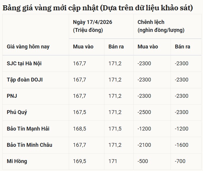 Giá vàng hôm nay 17/4/2026 tiếp tục ghi nhận những biến động đáng chú ý trên cả thị trường trong nước và quốc tế. Trong khi giá vàng SJC và vàng nhẫn 9999 có xu hướng điều chỉnh nhẹ, thì giá vàng thế giới lại tăng, khiến khoảng cách giữa hai thị trường tiếp tục bị nới rộng.