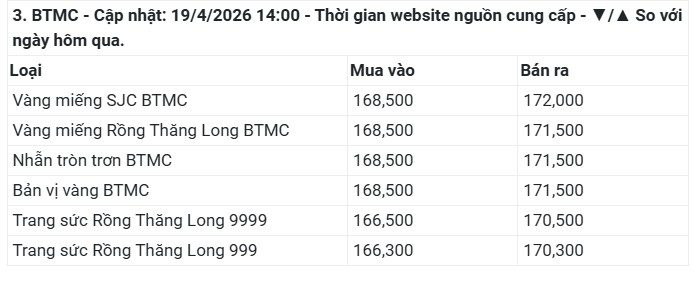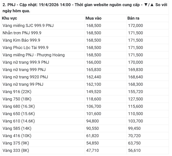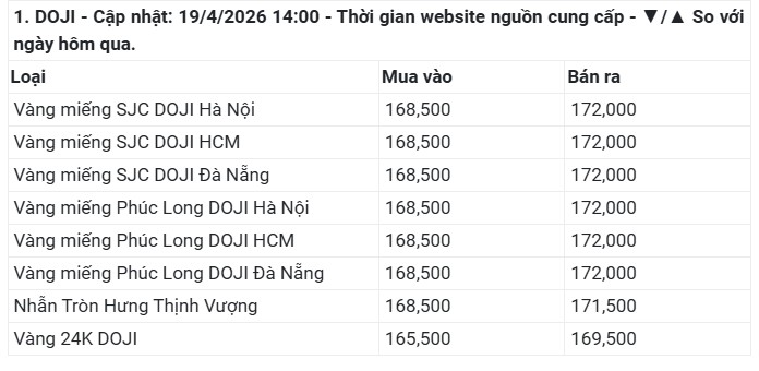Theo ghi nhận vào khoảng 17h cùng ngày, giá vàng miếng SJC được các hệ thống lớn như DOJI, PNJ, Bảo Tín Minh Châu niêm yết phổ biến ở mức 168,5 – 172 triệu đồng/lượng (mua vào – bán ra). So với phiên trước, giá vàng miếng chỉ điều chỉnh giảm nhẹ khoảng vài trăm nghìn đồng mỗi lượng, biên độ dao động không quá lớn và vẫn duy trì mặt bằng cao.