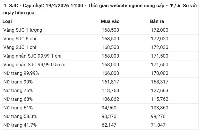 Giá vàng hôm nay 19/4/2026 ghi nhận diễn biến bất ngờ khi vàng nhẫn giảm mạnh hơn vàng miếng SJC, có nơi mất tới gần 1 triệu đồng/lượng. Chuyên gia cảnh báo khả năng tăng không còn dễ dàng như trước.