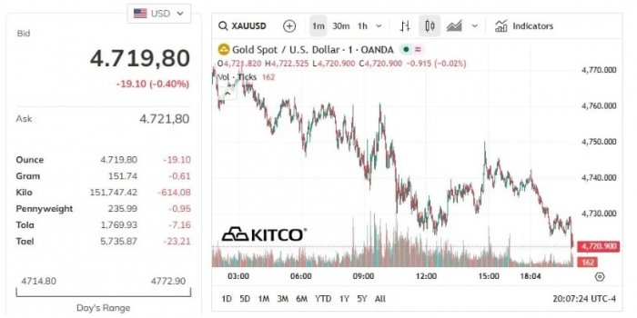 Trên thị trường quốc tế, giá vàng cũng đang chịu áp lực điều chỉnh. Ghi nhận vào phiên gần nhất, giá vàng giao ngay dao động quanh vùng thấp hơn so với các phiên trước, cho thấy xu hướng giảm vẫn đang chiếm ưu thế.