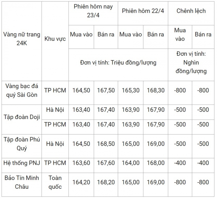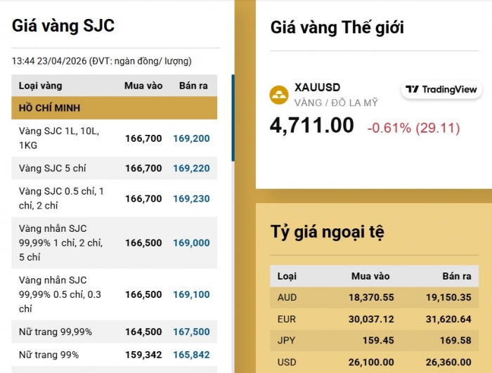 Giá vàng hôm nay 23/4 tiếp tục gây sốc khi vàng miếng SJC và vàng nhẫn tròn trơn đồng loạt giảm sâu, chính thức rời mốc 170 triệu đồng/lượng. Điều này phản ánh áp lực bán gia tăng và tâm lý thị trường đảo chiều nhanh chóng.