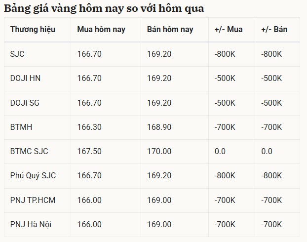 Tại DOJI, giá vàng tại cả Hà Nội và TP.HCM cùng giao dịch quanh 166,70 – 169,20 triệu đồng/lượng, giảm khoảng 500.000 đồng/lượng. Trong khi đó, PNJ điều chỉnh mạnh hơn khi giảm 700.000 đồng/lượng, đưa giá về 166,00 triệu đồng/lượng mua vào và 169,00 triệu đồng/lượng bán ra.