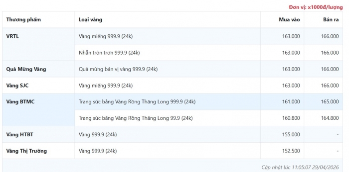 Giá vàng hôm nay 29/4/2026: Đồng loạt giảm sâu phiên thứ hai liên tiếp