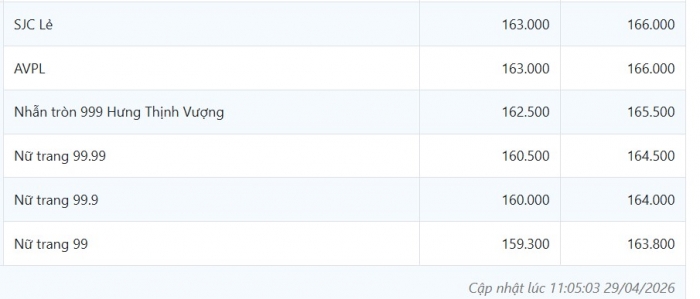 Cập nhật lúc 09h30 sáng thứ Tư (29/4/2026), thị trường vàng trong nước tiếp tục ghi nhận một phiên giảm mạnh trên diện rộng. Đây là phiên thứ hai liên tiếp giá vàng đi xuống trong tuần, với mức điều chỉnh phổ biến từ 1 triệu đến 1,5 triệu đồng/lượng so với hôm qua.