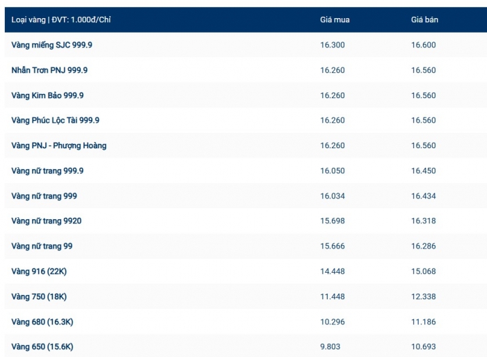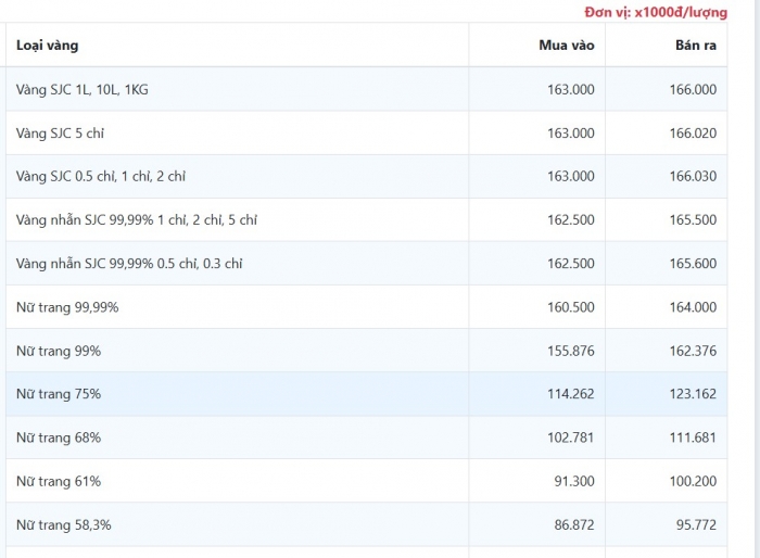 Bảo Tín Minh Châu giao dịch vàng nhẫn ở mức 163,0 – 166,0 triệu đồng/lượng, giảm khoảng 1,5 triệu đồng/lượng. Trong khi đó, Phú Quý niêm yết ở mức 162,5 – 165,5 triệu đồng/lượng, cũng giảm 1,5 triệu đồng/lượng ở cả hai chiều mua và bán.