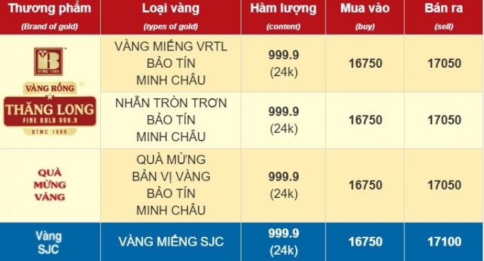 Tương tự, Bảo Tín Minh Châu, PNJ và nhiều doanh nghiệp khác cũng niêm yết vàng SJC ở mức 167,7 – 171,2 triệu đồng/lượng, cho thấy mặt bằng giá trong nước đang đồng thuận theo xu hướng giảm.