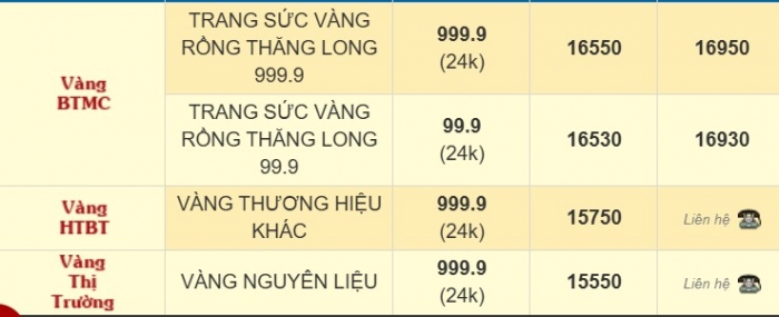 Không chỉ vàng miếng, giá vàng nhẫn 9999 hôm nay cũng giảm sâu từ 1,8 – 2,8 triệu đồng/lượng. Tại Bảo Tín Minh Châu, nhẫn tròn trơn Vàng Rồng Thăng Long giao dịch ở mức 167,5 – 170,7 triệu đồng/lượng, giảm khoảng 2 – 2,2 triệu đồng/lượng.