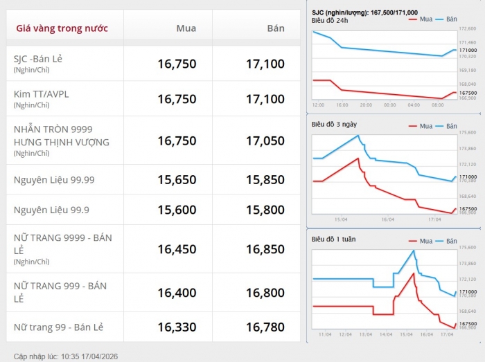 Ghi nhận sáng 17/4, giá vàng miếng SJC bán ra phổ biến ở mức 171,2 triệu đồng/lượng, giảm mạnh 1,6 triệu đồng/lượng so với đầu giờ sáng hôm qua. Đây là mức giảm đáng chú ý, đưa giá vàng tiến sát ngưỡng tâm lý quan trọng 170 triệu đồng/lượng.