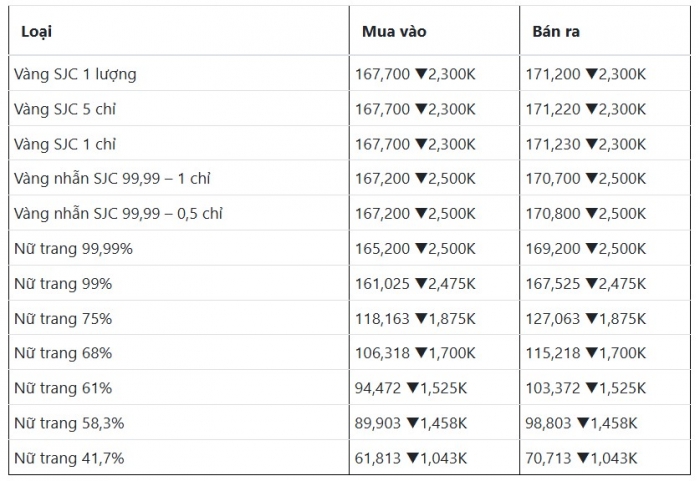 Tại các hệ thống kinh doanh lớn, giá vàng SJC được niêm yết tương đối đồng đều. Tại DOJI ở Hà Nội và TP.HCM, giá giao dịch quanh 167,7 – 171,2 triệu đồng/lượng (mua – bán), giảm 1,6 triệu đồng/lượng ở cả hai chiều. Chênh lệch mua – bán duy trì ở mức 3,5 triệu đồng/lượng.