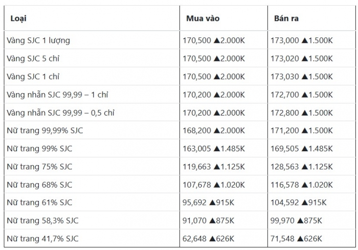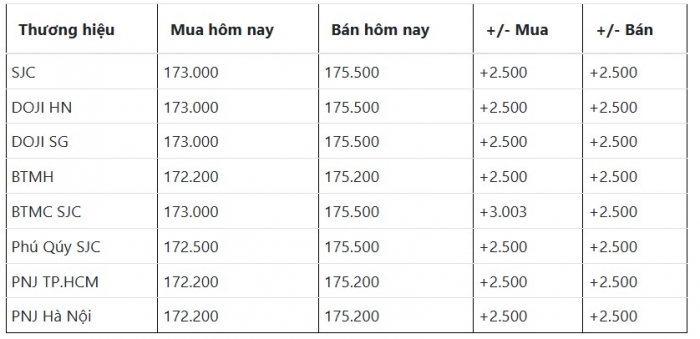 Sáng ngày 15/4/2026, thị trường vàng trong nước đồng loạt tăng mạnh từ 2–3 triệu đồng/lượng so với phiên trước. Các thương hiệu lớn như SJC, DOJI, PNJ, Phú Quý, Bảo Tín Minh Châu đều điều chỉnh giá theo xu hướng đi lên, đưa mặt bằng giá vàng lên mức cao trong nhiều phiên gần đây. Đáng chú ý, vàng miếng SJC hiện được niêm yết phổ biến ở mức 173,0 triệu đồng/lượng mua vào và 175,5 triệu đồng/lượng bán ra.