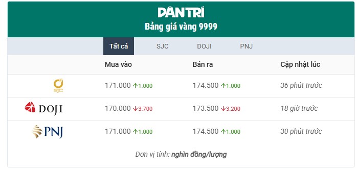 Không chỉ SJC, các thương hiệu lớn như PNJ, DOJI, Phú Quý, Bảo Tín Minh Châu hay Mi Hồng cũng đồng loạt điều chỉnh giá vàng miếng xuống dưới 174 triệu đồng/lượng, cho thấy xu hướng giảm diễn ra trên diện rộng.
