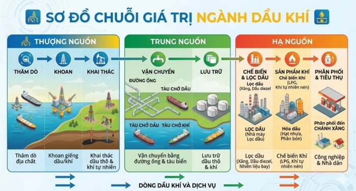 Trong bối cảnh đó, chuỗi giá trị ngành dầu khí – bao gồm thượng nguồn, trung nguồn và hạ nguồn – đang có sự phân hóa rõ rệt về mức độ hưởng lợi.