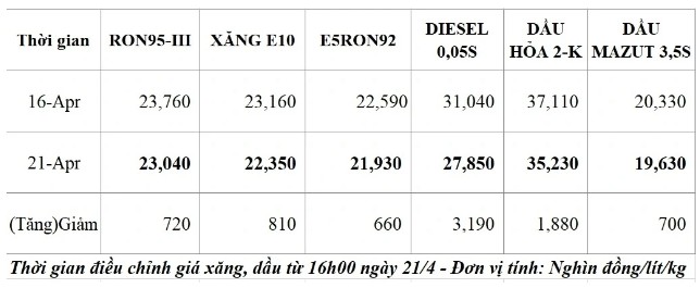 Giá dầu diesel 0.05S từ 16h00 ngày 21/4 giảm sâu 3.190 đồng/lít, giá bán mới là 27.850 đồng/lít; Dầu hỏa giảm 1.880 đồng/lít, giá bán là 35.230 đồng/lít; Giá dầu mazut 180CST 3.5S kỳ này giảm 700 đồng/lít, giá bán mới là 19.630 đồng/kg.
