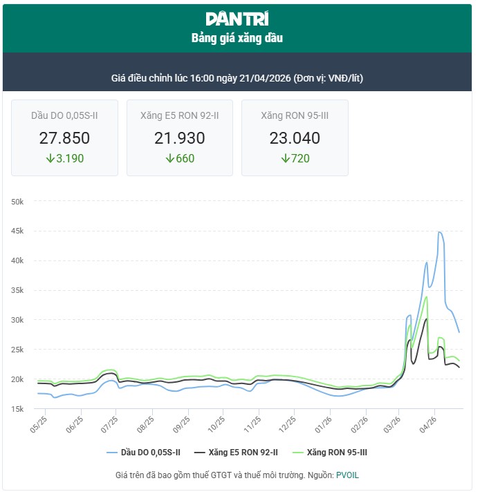 Theo liên Bộ Công Thương – Bộ Tài chính, từ 15h ngày 23/4, giá xăng E5 RON 92 giảm 100 đồng/lít xuống còn 21.830 đồng/lít, trong khi xăng RON 95 giảm 160 đồng/lít còn 22.880 đồng/lít. Cùng với đó, dầu diesel tiếp tục giảm sâu 1.160 đồng/lít, về mức 26.690 đồng/lít; dầu mazut cũng giảm 820 đồng/kg, còn 18.810 đồng/kg.