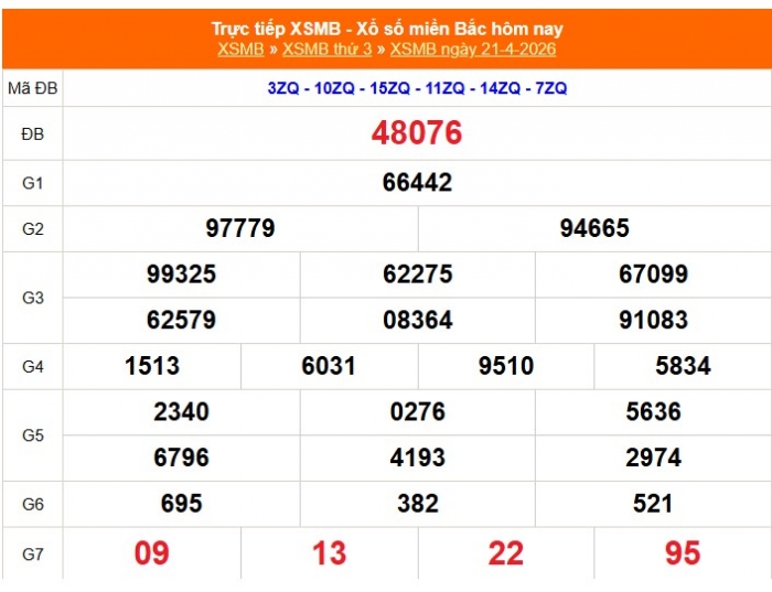 Kết quả Xổ số miền Bắc ngày 21/4/2026