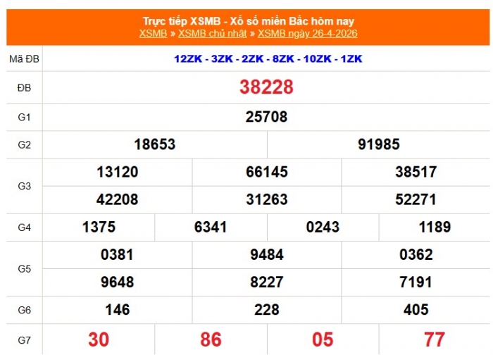 Kết quả Xổ số miền Bắc ngày 26/4/2026