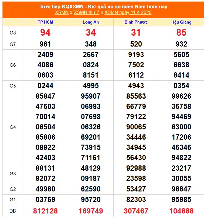 Kết quả xổ số miền Nam (KQXSMN) ngày 12/4/2026 được quay thưởng vào lúc 16h15 theo khung giờ cố định hằng ngày. Người chơi có thể theo dõi trực tiếp tại các đài hoặc tra cứu nhanh kết quả xổ số miền Nam hôm nay ngay sau khi quay số kết thúc. Đây là khu vực có tần suất mở thưởng liên tục, mỗi ngày từ 3-4 đài, đảm bảo công khai và minh bạch trong từng kỳ quay.