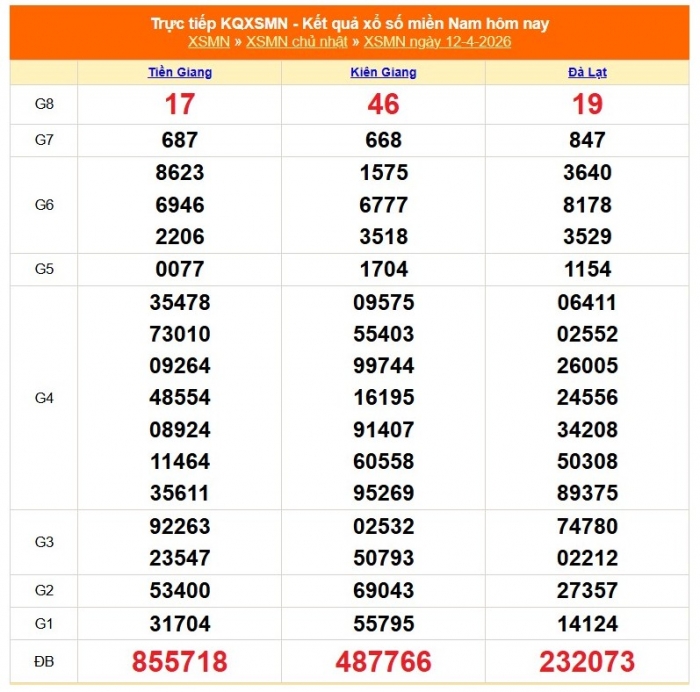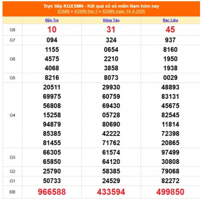 Kết quả xổ số miền Nam (KQXSMN) ngày 15/4/2026 được quay thưởng vào lúc 16h15 theo khung giờ cố định hằng ngày. Người chơi có thể theo dõi trực tiếp tại các đài hoặc tra cứu nhanh kết quả xổ số miền Nam hôm nay ngay sau khi quay số kết thúc. Đây là khu vực có tần suất mở thưởng liên tục, mỗi ngày từ 3-4 đài, đảm bảo công khai và minh bạch trong từng kỳ quay.