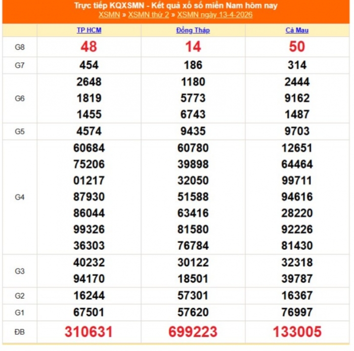 Kết quả xổ số miền Nam ngày 13/4/2026