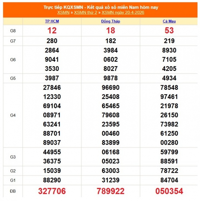 Kết quả xổ số miền Nam ngày 20/4/2026