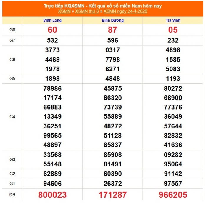 XSMN 24/4: Kết quả xổ số miền Nam ngày 26/4/2026 (đang cập nhật)