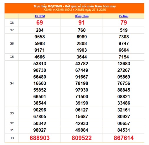 Kết quả xổ số miền Nam ngày 27/4/2026