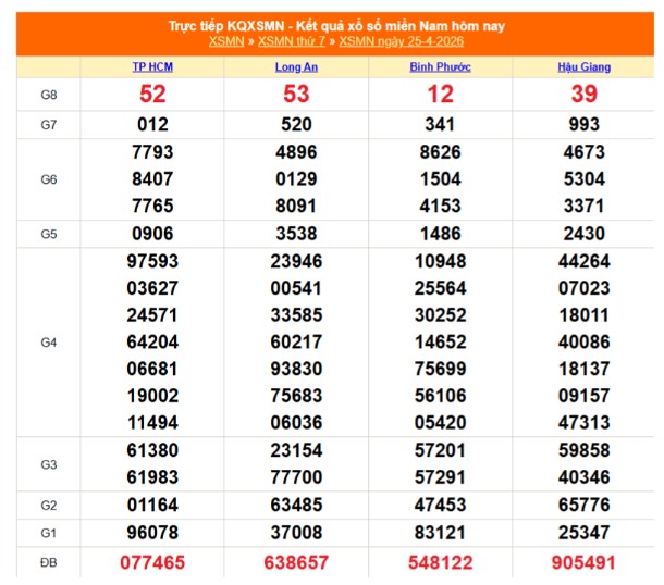 Kết quả xổ số miền Nam ngày 25/4/2026