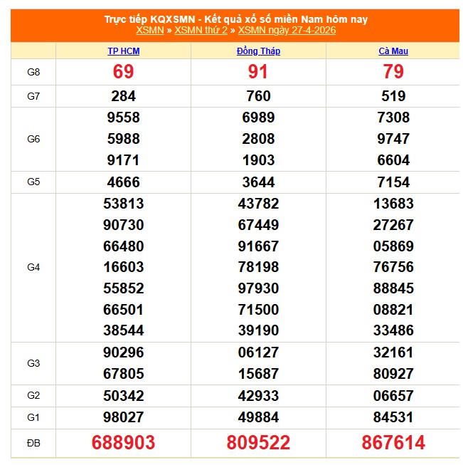 Kết quả xổ số miền Nam ngày 27/4/2026